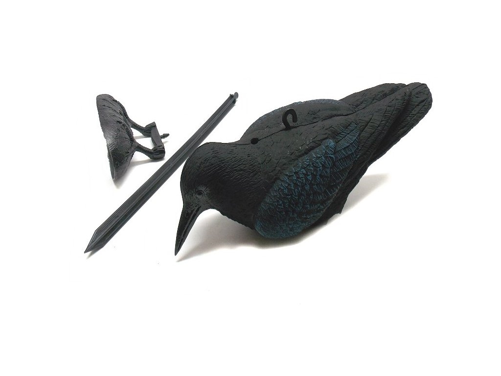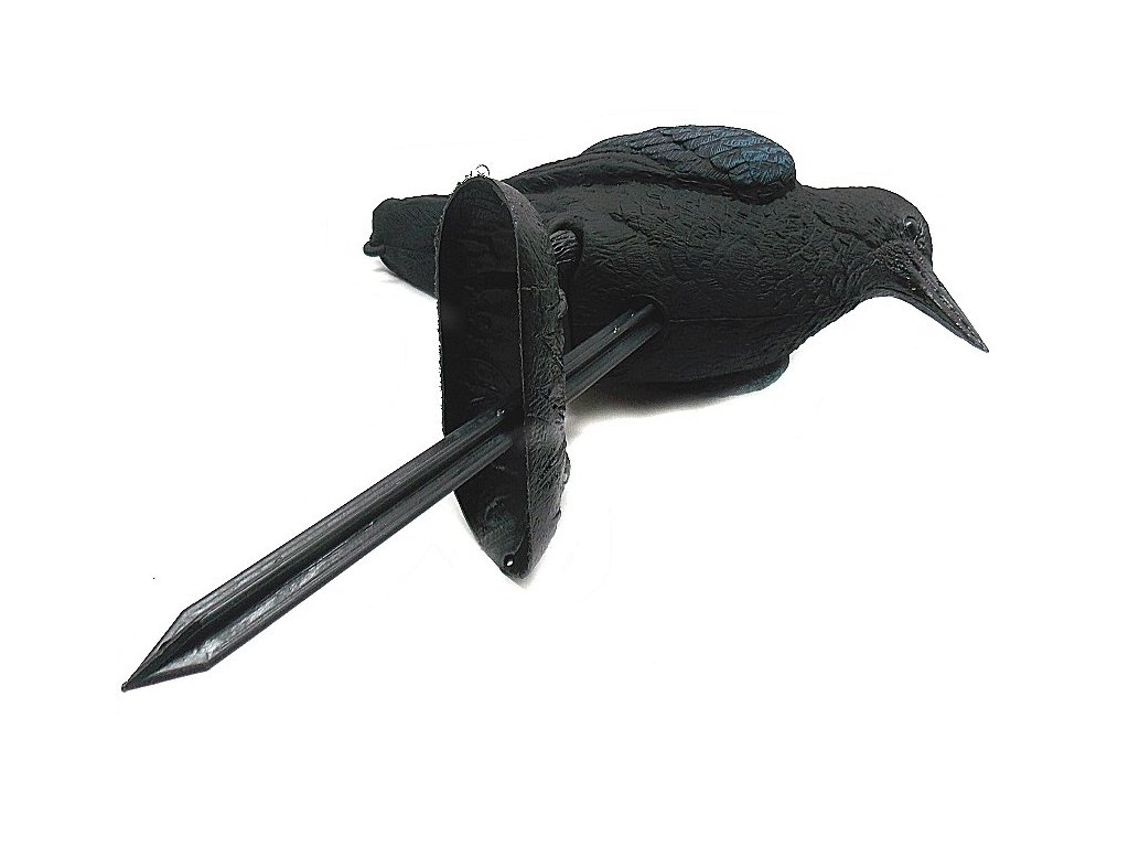 Corvo in plastica, vuoto all interno, dotato di gambe ed asta per fissarlo al terreno e di un gancio per essere appeso e dargli movimento. Altezza massima 30 cm, larghezza 46 cm. per il massimo risultato è molto importante che il corvo venga cambiato saltuariamente di posizione in quanto gli uccelli tendono ad abituarsi. Prodotto fatto in Italia. Peso lordo: 83 grammi