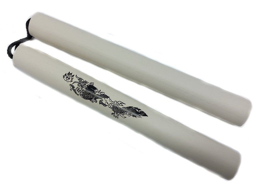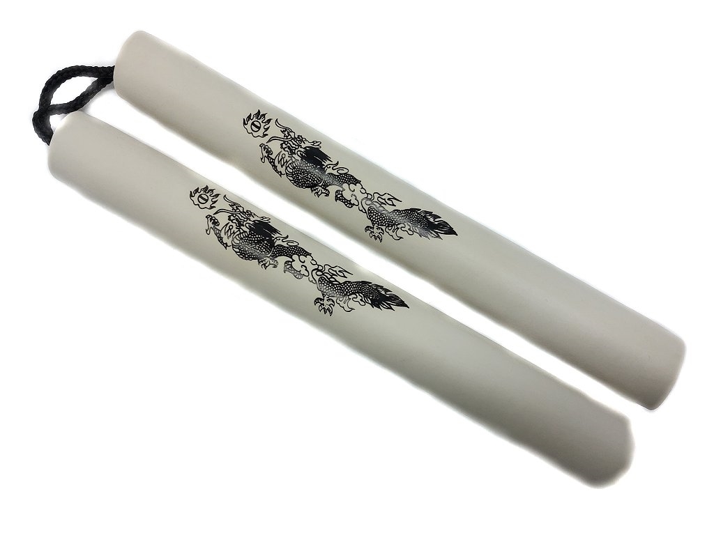 Nunchaku in gomma bianca con corda per allenamento arti marziali, uso sportivo. Lunghezza totale (da estremità a estremità) del nunchaku 73 cm. Peso lordo: 170 grammi.