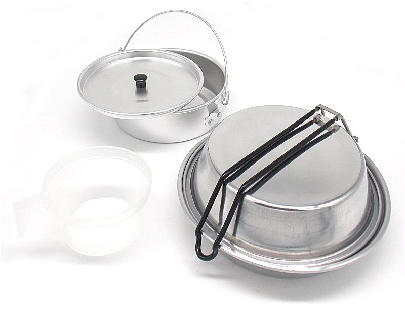 In alluminio lucidato. La scatola contiene: 2 tegami di cui uno con manico, 1 pentola con coperchio, 1 tazza in plastica. Diametro 19 cm chiuso. Peso: 250 grammi. Peso lordo: 331 grammi