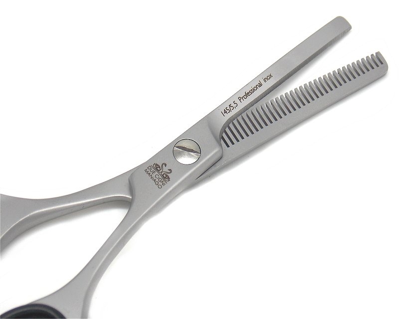 Forbici in acciaio inox sabbiato da barbiere con 35 dentini. lunghezza 14 cm. Ideale per sfoltirei capelli. Prodotto in Italia. Peso lordo: 48 grammi.