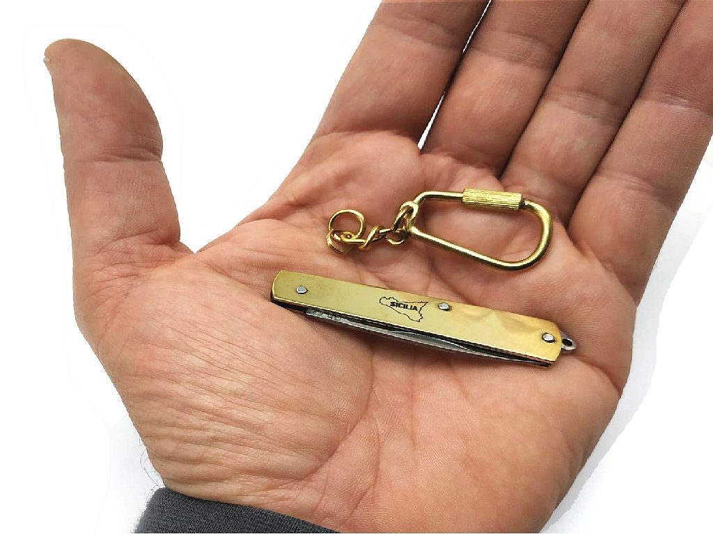 coltello sportivo. lunghezza lama 7 cm, larghezza lama 1 cm. lama in acciaio inox e manico ottone con incisione sicilia sul manico . prodotto in itali ...