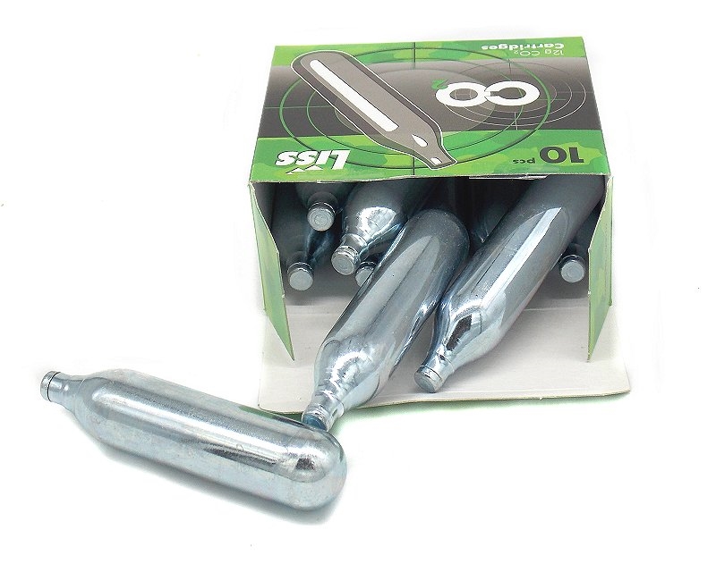 Bomboletta di anidride carbonica per ricarica pistole a piombini. Contenuto: 12 grammi. Confezione da 10 pezzi. Peso lordo: 436 grammi