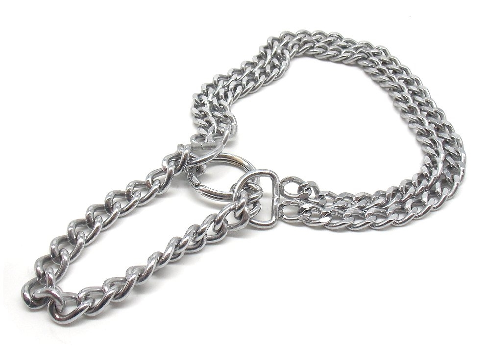 Collare semi strangolo in metallo cromato con circonferenza minima del collare di 40 cm e massima 50 cm, larghezza maglia 1,5 cm. Peso lordo: 145 grammi. Prodotto in Italia.