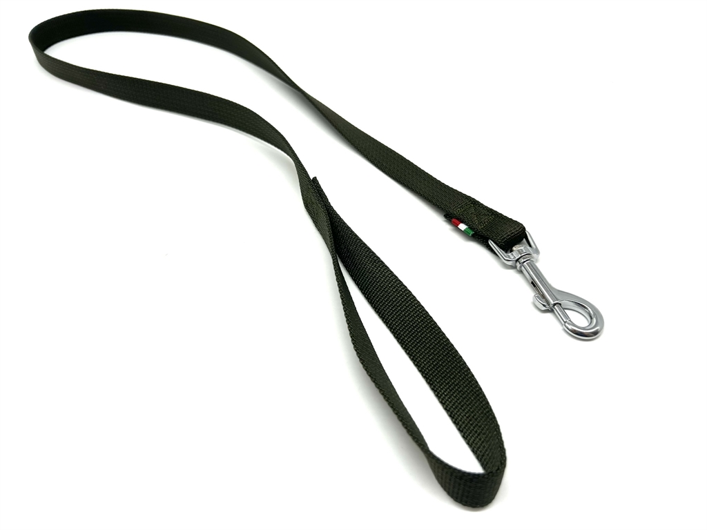 Guinzaglio in nylon verde con moschettone in metallo. Lunghezza totale del guinzaglio 110 cm e larghezza 2 cm. Prodotto in Italia. Peso lordo: 71 grammi
