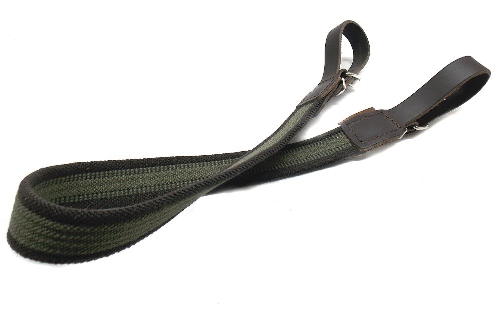 Bretella porta fucile in tessuto elasticizzato con attacchi in cuoio. Larghezza 3 cm, lunghezza totale 72 cm. Colore verde con perfili marroni. Prodotto in Italia. Peso lordo: 90 grammi.