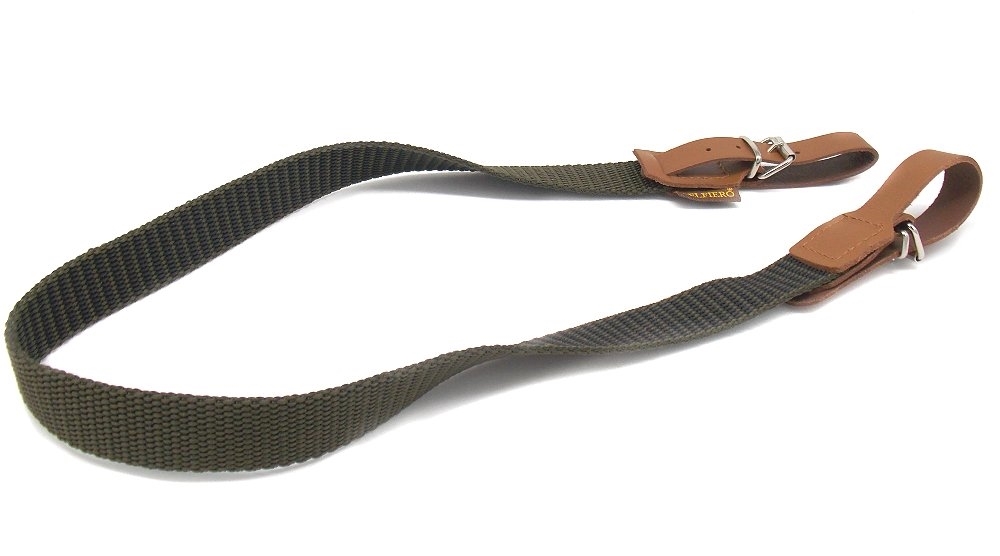 Bretella porta fucile in tela con antiscivolo incorporato e attacchi in cuoio. Dimensioni: larghezza 3 cm, lunghezza totale 89 cm. Colore verde scuro. Peso lordo: 75 grammi. Prodotto in Italia.
