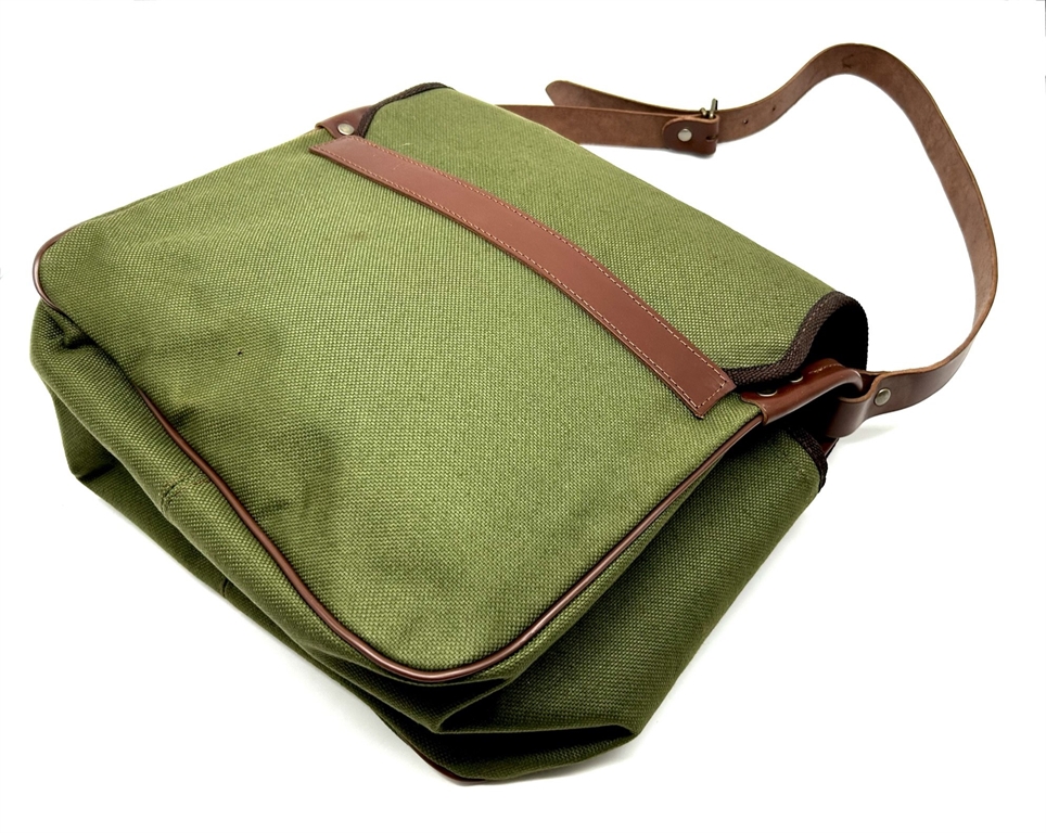 Lunghezza cm 27, larghezza cm 35, profondità cm 17,5. Doppio scomparto interno. L'interno è in nylon sfoderabile e lavabile. Tracolla in cuoio regolabile. Riporti in cuoio. Data la dimensione si presta per il trasporto di conigli. Peso lordo: 800 grammi. Prodotto in Italia.