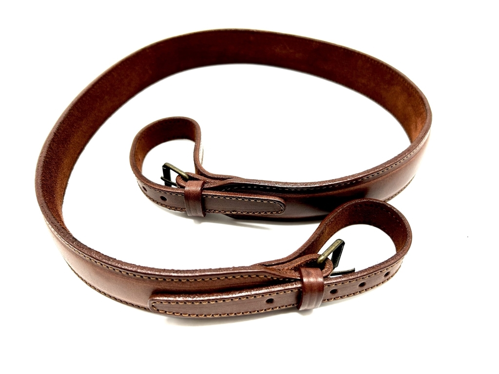 Bretella porta fucile in pelle tinta in botte. Lunghezza massima 100 cm, larghezza 28 mm. Fibbie in ottone. Manifattura toscana- Italia.Peso lordo: 140 grammi