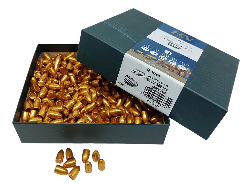Palla H&N in piombo ramato ogivale calibro 9, 125 grani rn, peso gr. 8,10, trafilatura .356/9,04 mm diametro. Confezione da 500 pezzi. Prodotto in Germania. Peso lordo: 4175 grammi.