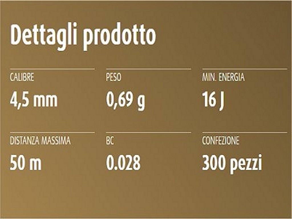 Pallini in piombo placcati in rame a testa tonda con imbuto liscio, calibro 4,5 per carabina aria compressa. Confezione da 300 pezzi. Prodotto in Germania. Peso lordo: 229 grammi