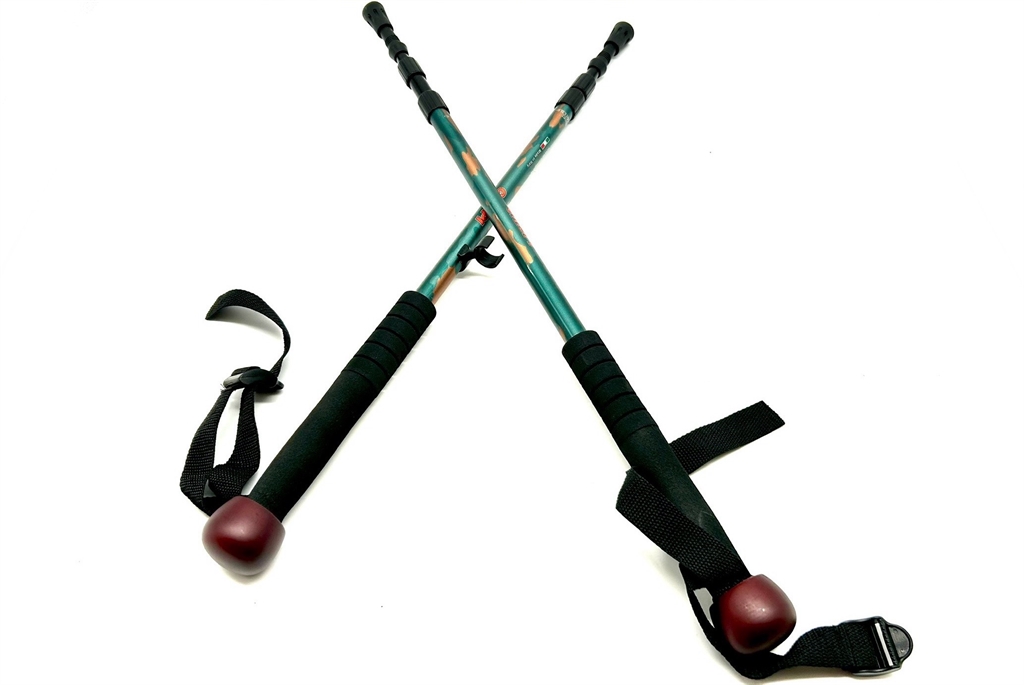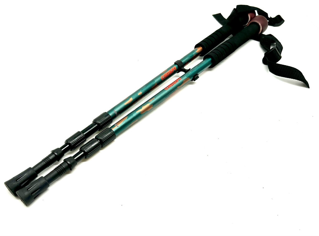 Coppia di bastoni telescopici estensibili da trekking in alluminio con forcella di appoggio e adattatore per macchina fotografica. Con tappi in gomma parapunta per superfici dure, puntali in acciaio. Impugnatura in morbido neoprene. Estensibili da 82 a 140 cm. Dotati di custodia in tela con cinghia a tracolla regolabile per il trasporto. Prodotto in Italia. Peso lordo: 720 grammi.