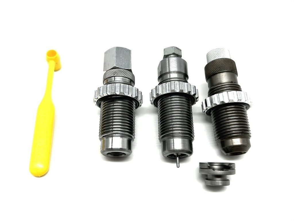 IL set include: misurino in platica per polvere, reggibossolo ( shell holder ), il die che ricalibra il bossolo e espelle l'innesco spento ( sizing die ), il die che svasa la bocca del bossolo per favorire l'inserimento della palla e inserisce la polvere ( expanding die ), il die che inserisce la palla e restringe le pareti del bossolo ( seating die ), la scatola in plastica e le istruzioni in inglese. Prodotto in USA. Peso lordo: 560 grammi.