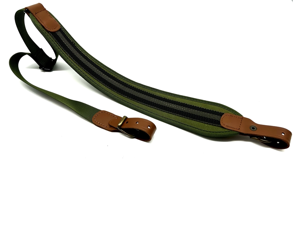 Bretella in cordura verde con antiscivolo ed attacchi in cuoio. Larghezza massima 7 cm. Lunghezza massima 110 cm, comunque regolabile. Peso lordo: 155 grammi. Prodotto in Italia.