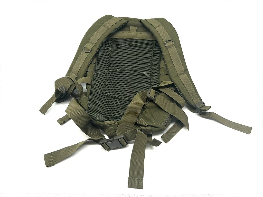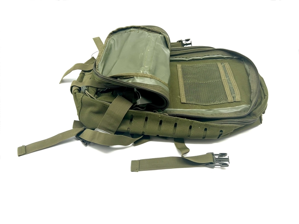 Zaino tattico realizzato in resistente nylon con doppie cuciture e con sistema molle con taglio eseguito al laser. Schienale imbottito e retinato per un confort ottimale. Dotato di due vani grandi con cerniera, sul davanti due tasche con cerniera, varie tasche interne. Maniglia per il trasporto, spallacci imbottiti e regolabili, cintura aggancio rapido, regolazioni laterali. Dimensioni: 45x22x13 cm. Peso lordo: 1160 grammi.