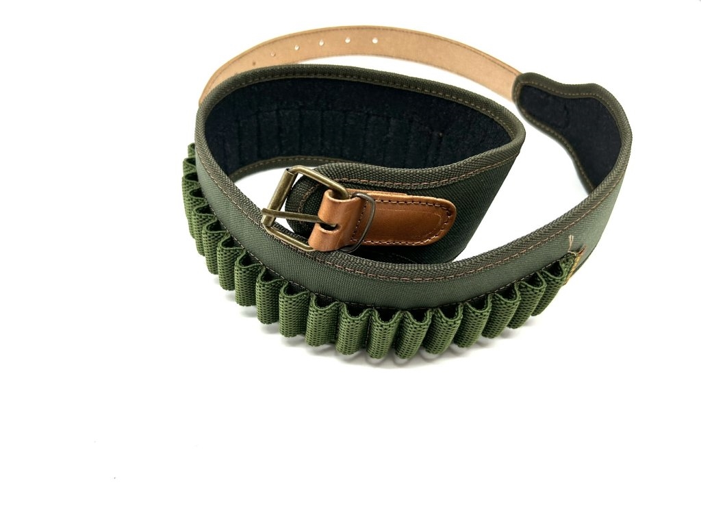 Cartuccera in cordura verde con 30 celle elastiche. Chiusura in cuoio, fibbia in ottone. Lunghezza girovita massima 123 cm, larghezza 8,3 cm. Peso lordo: 165 grammi. Prodotto italiano.