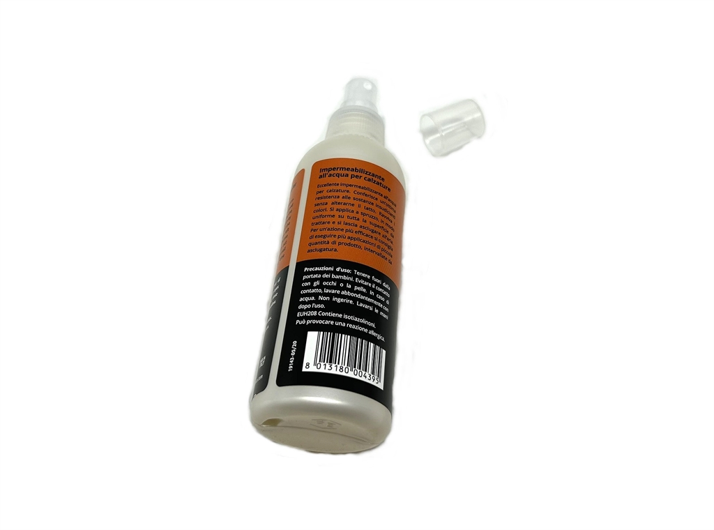 Eccellente impermeabilizzante all'acqua per calzature. Conferisce un'ottima resistenza alle sostanze insudicianti senza alterare il tatto. Ravviva i colori. Si applica a spruzzo, in modo uniforme su tutta la superficie da tracciare e si lascia asciugare all'aria. Flacone da 150 ml. Peso lordo: 180 grammi. Prodotto in Italia.