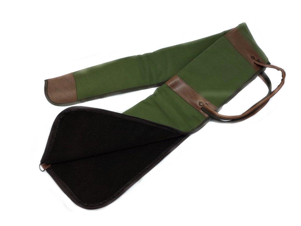 Fodero in canvas verde con rifiniture in cuoio, imbottito in finto orsetto marrone. Chiusura con cerniera. Puntale rinforzato in cuoio. Manici in cuoio e tela. Predisposto per mettere la bretella (non in dotazione). Lunghezza interna 138 cm. Peso lordo: 745 grammi. Prodotto in Italia.