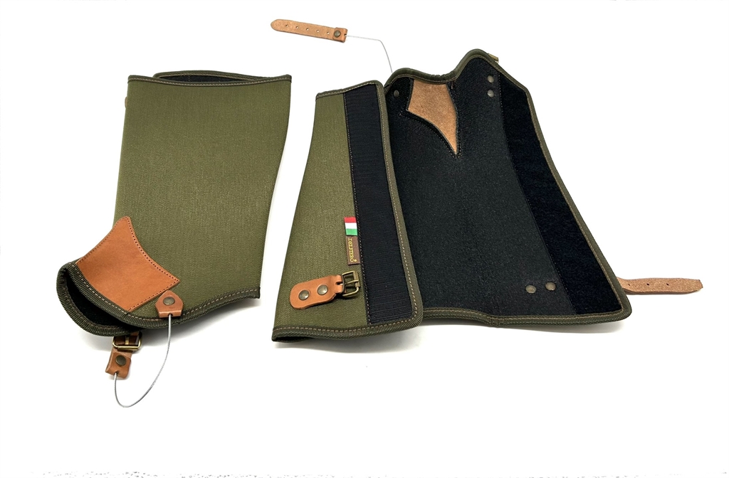Ghette in cordura verde con rifiniture in cuoio. Chiusura con velcro. Con archetto in metallo regolabile con cinghietta in cuoio. Misura unica, regolabile tramite velcro. Altezza 37 cm. Peso lordo: 475 grammi. Prodotto in Italia.