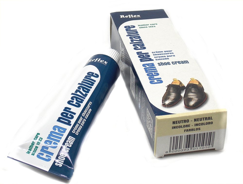 Crema neutra speciale per calzature, con cere e siliconi. Resiste all'acqua, protegge e ridona brillantezza. Peso lordo: 70 grammi. Contenuto 50 ml.