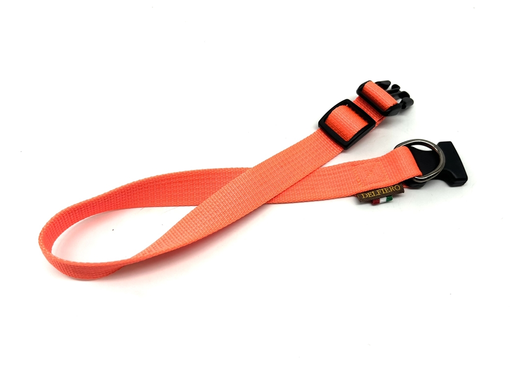 Collare in nylon arancione regolabile con fibbia in plastica nera. Lunghezza massima del collare 60 cm e larghezza 2,5 cm. Peso lordo: 55 grammi. Prodotto in Italia.