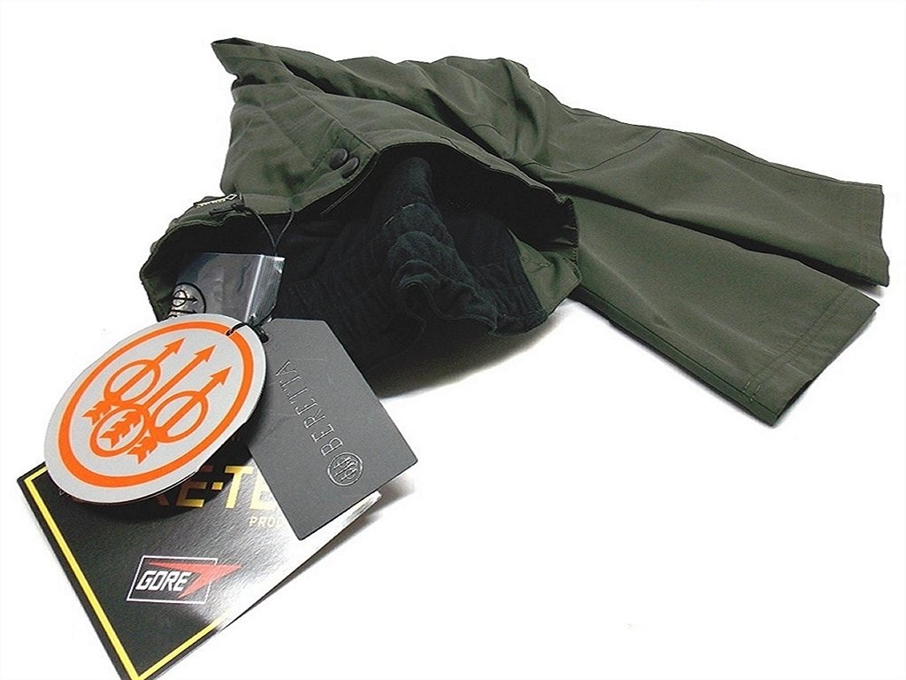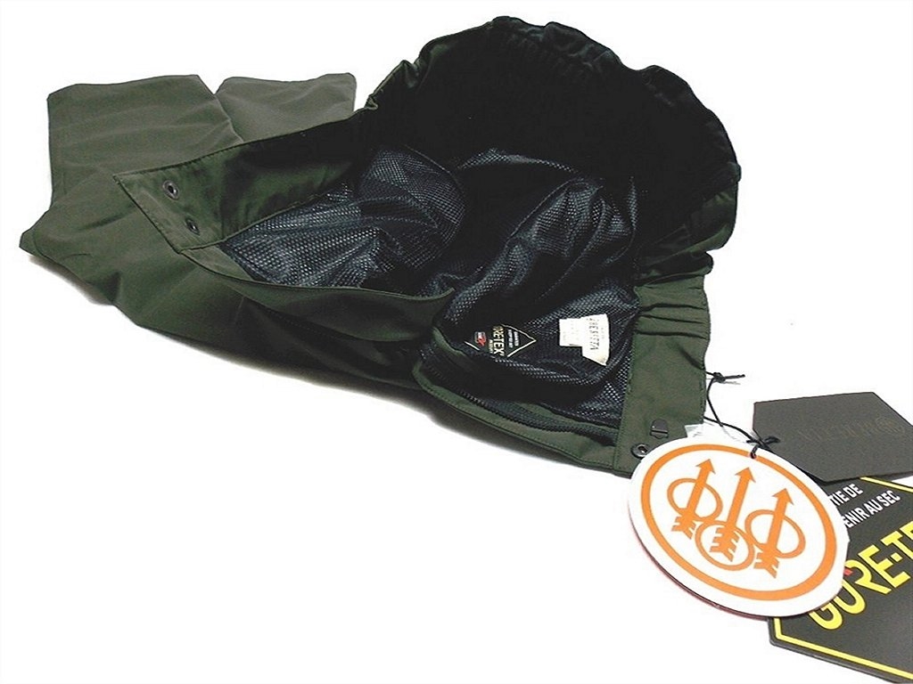 Pantaloni da caccia in tessuto a due strati di Gore Tex, con cuciture nastrate e fodera interna in rete traspirante. Con elastico in vita. Dotato di quattro tasche con cerniera coperta, di cui due davanti e due dietro. Peso lordo: 615 grammi. Misure disponibili: 48 (M), 50 (L), 52 (XL), 54 (XXL).