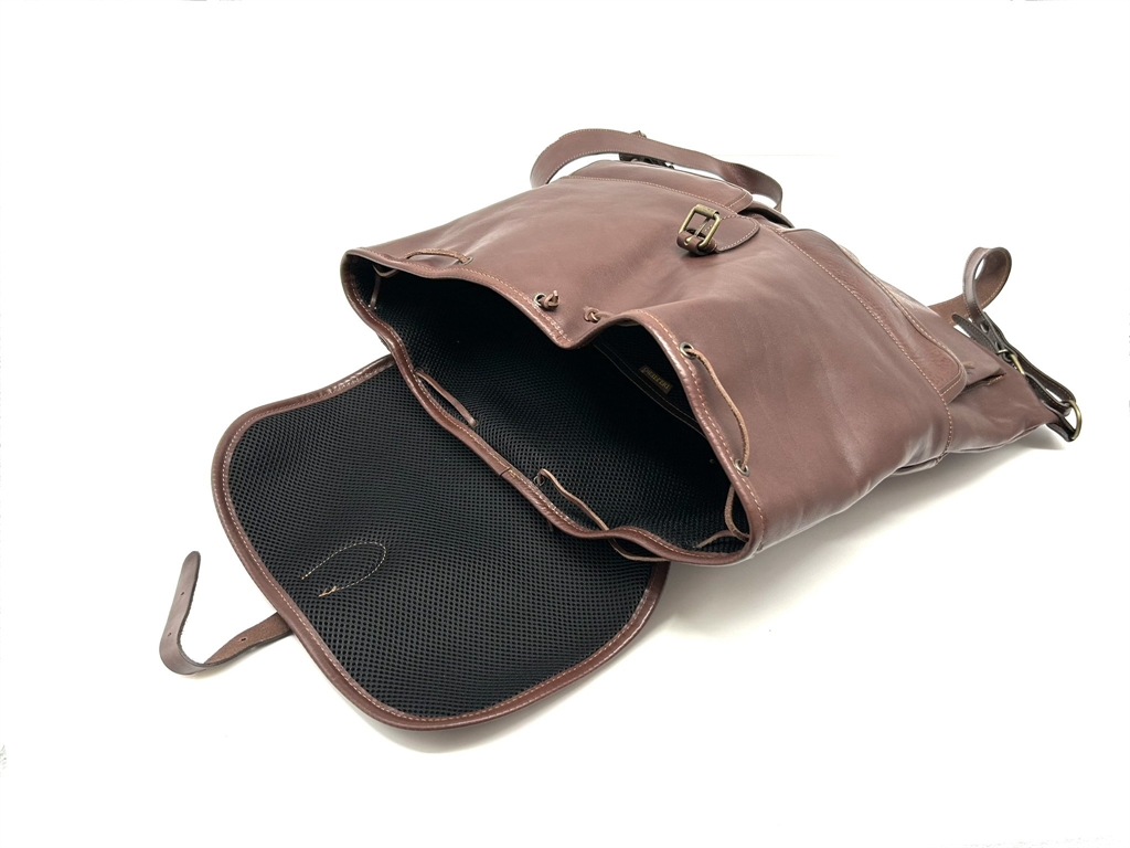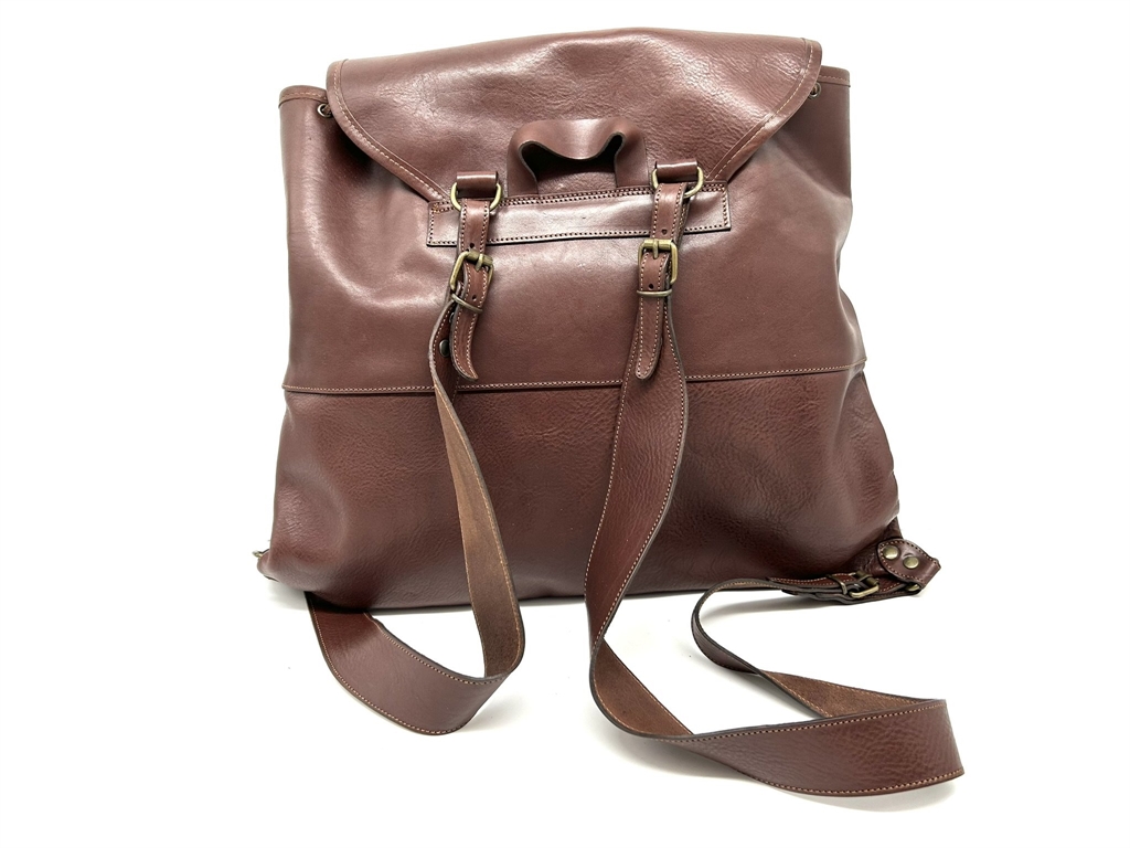 Zaino in cuoio marrone. Dotato sul davanti di due tasche con cerniera ed una tasca interna 22x13 cm. Altezza/profondità 40 cm, larghezza massima 50 cm, spessore regolabile tramite laccetti. Spallacci in cuoio regolabili. Foderato internamente. In dotazione portachiavi in cuoio. Peso lordo: 1425 grammi. Prodotto in Italia.