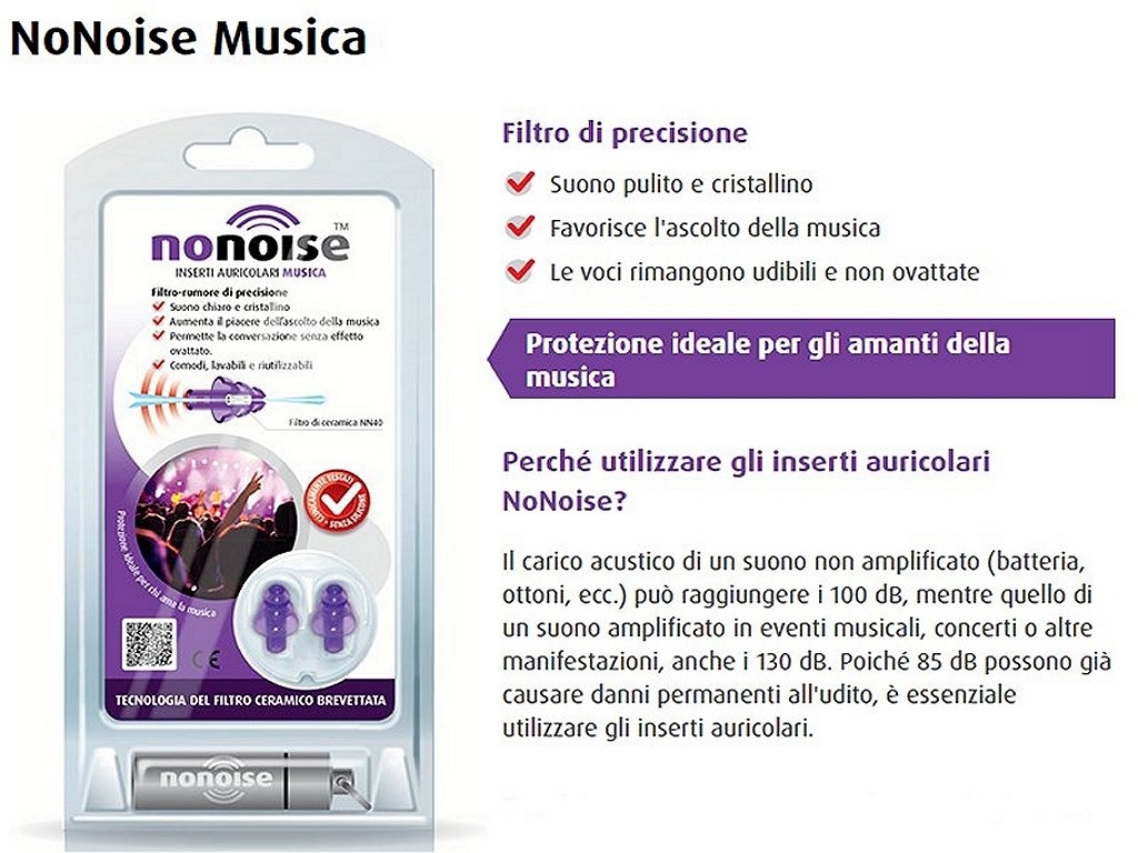 Il carico acustico di un suono non amplificato può raggiungere i 100 dB, mentre quello di un suono amplificato in eventi musicali, concerti o altre manifestazioni, anche i 130 dB.Poiché 85 dB possono già causare danni permanenti all'udito, è essenziale utilizzare gli inserti auricolari.Gli inserti auricolari noNoise MUSICA sono messi a punto con precisione per un'ottima attenuazione alle frequenze richieste dagli amanti di musica.L'attenuazione media misurata da un Organismo indipendente (en352-2-2002) è di 28,5 db alle frequenze più alte (le più dannose).Senza silicone. Con cordicella in dotazione. Peso lordo:60 grammi