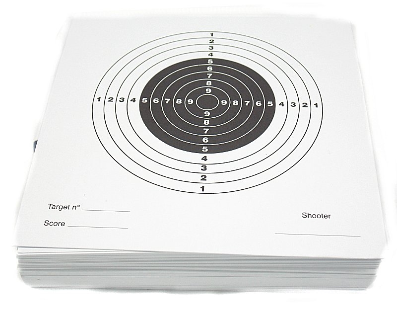 Bersaglio in cartoncino bianco 14x14 cm. Confezione da 100 pezzi. Peso lordo: 490 grammi.