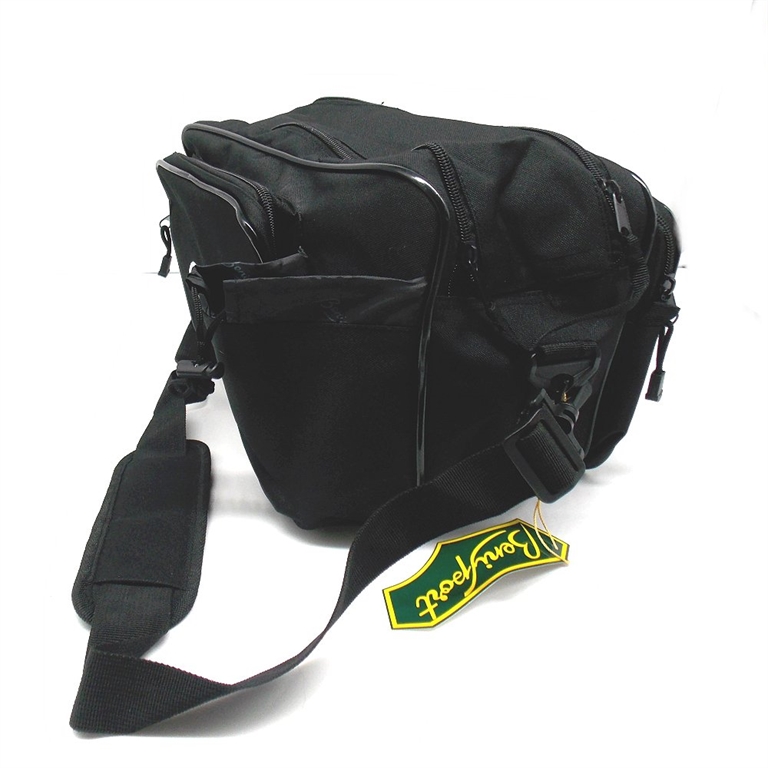 Borsa da tiro in resistente poliestere. L'interno è foderato con tessuto stampato. Dotato di tracolla regolabile. Ampio vano centrale con cerniera. Due ampie tasche uno sul retro e una sul davanti. Misure: 34x20x24 cm. Colore nero. Peso lordo: 625 grammi.
