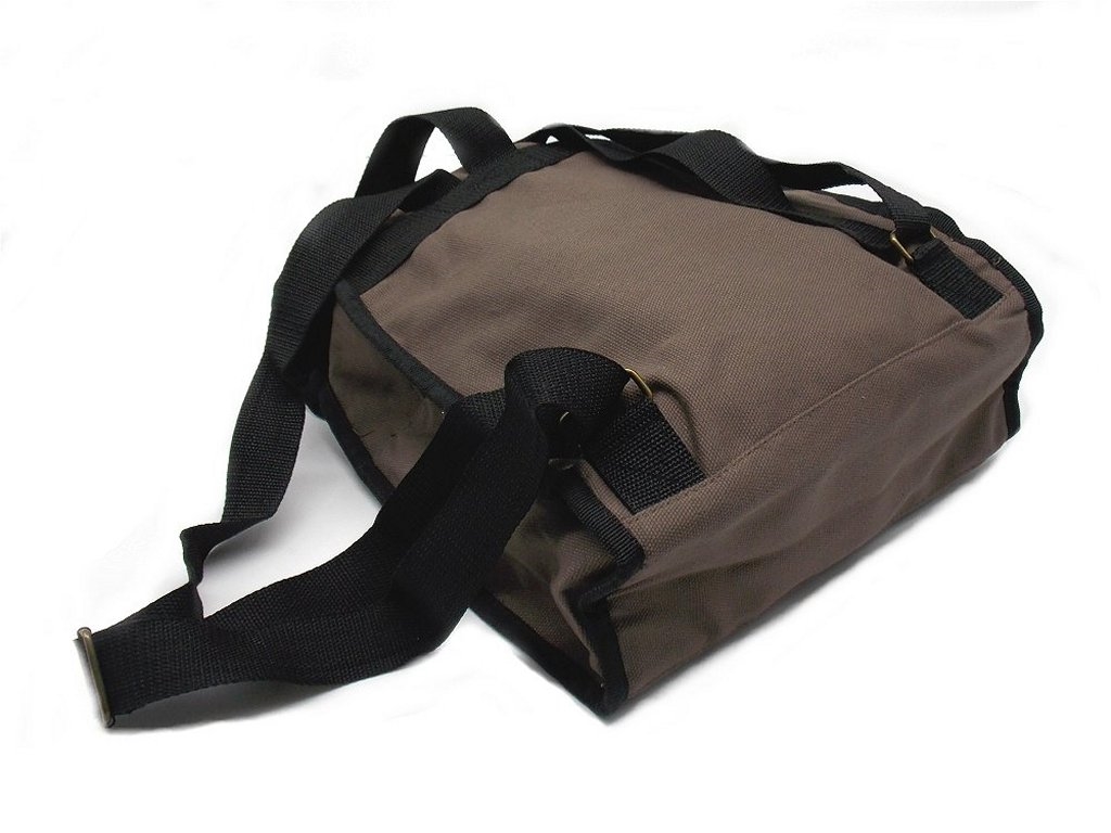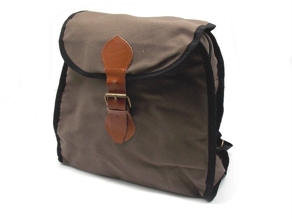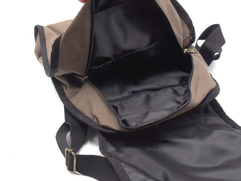 Zainetto in tessuto canvas marrone foderato all'interno con 2 tasche interne, taschino porta cellulare. Capacità 10 litri. Chiusura con cerniera e pattina con fibbia. Spallacci regolabili. Larghezza 26 cm, altezza 33 cm, profondità 11 cm. Peso lordo: 300 grammi.