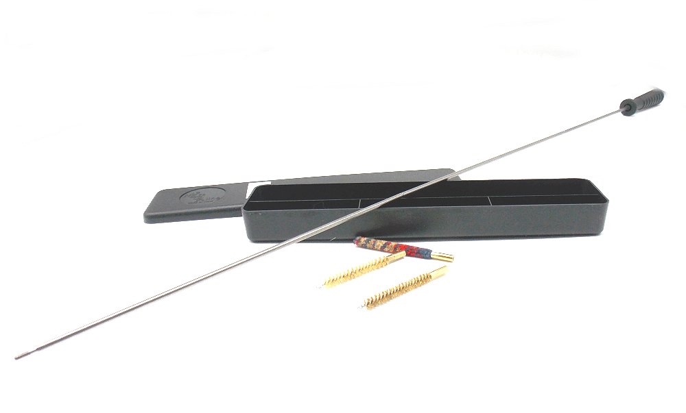 Composto da asta in acciaio con manico polimero antiscivolo girevole, componibile in tre pezzi più set tre scovoli. Completo per la pulizia della carabina ad aria compressa calibro 5,5. Confezione in scatola di plastica. Prodotto in Italia. Peso lordo: 254 grammi.