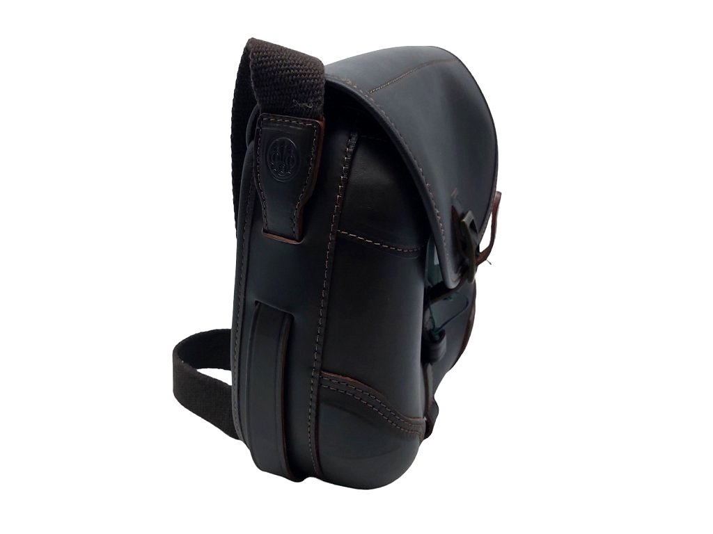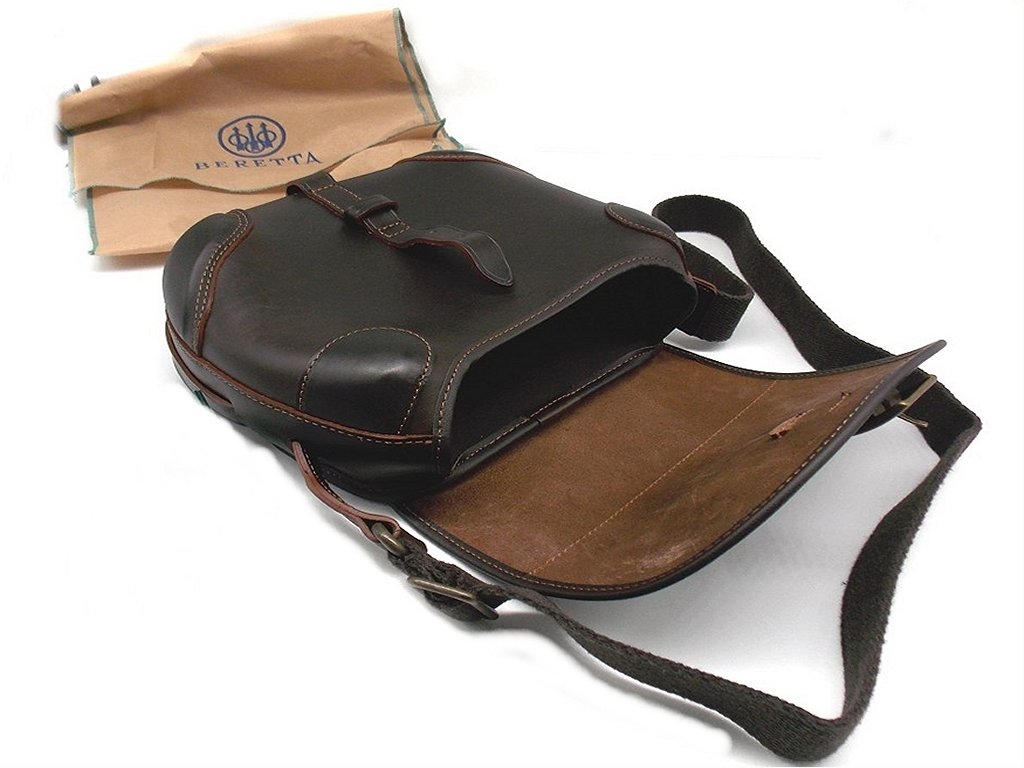 Borsa porta cartucce in pregiato cuoio. Colore: marrone scuro. Chiusura con fibbia in ottone. Con tracolla in tela regolabile. Dimensioni: 26x23x10 cm. Peso lordo: 995 grammi. Dotato di una custodia in tela leggera.