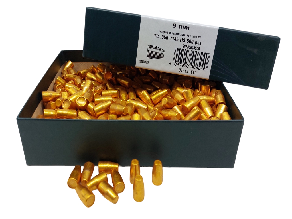 Palla H&N sport in piombo ramato tronco conica calibro 9 mm 145 grani rn, trafilatura .356/ 9,04 mm diametro, peso 9,40 grammi. Confezione 500 pezzi. Peso lordo: 4810 grammi. Prodotto in Germania.
