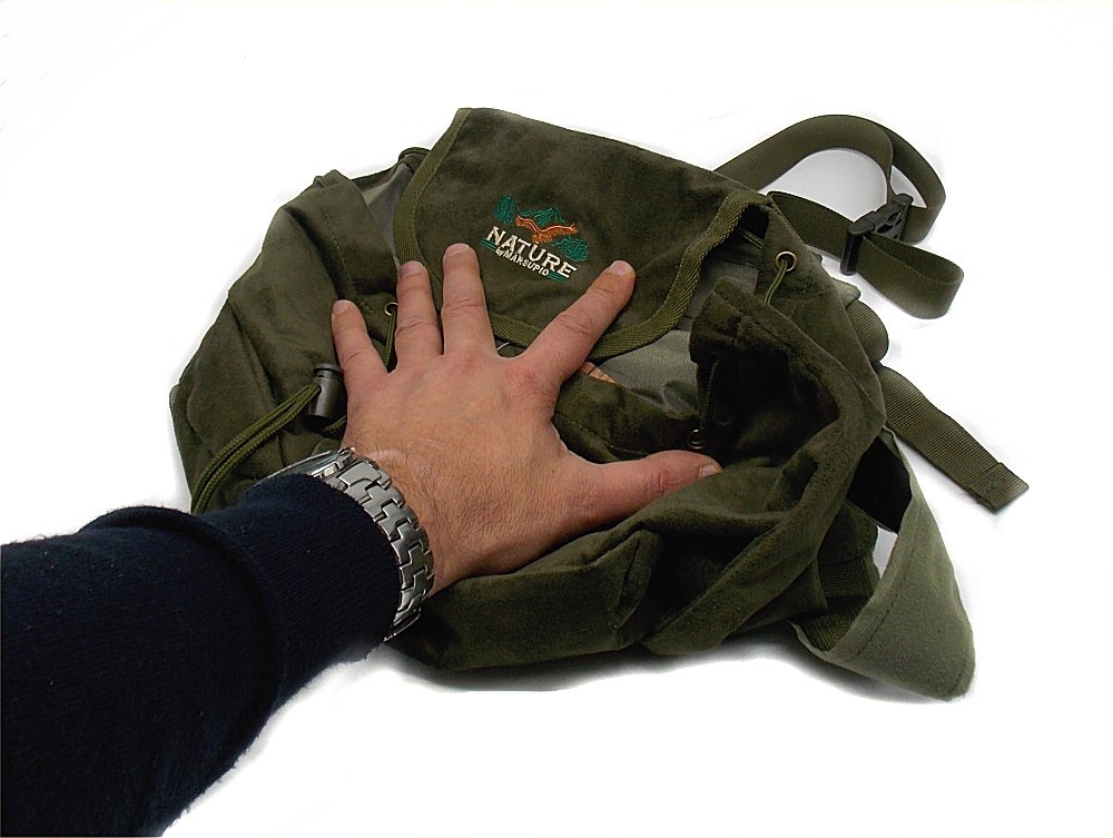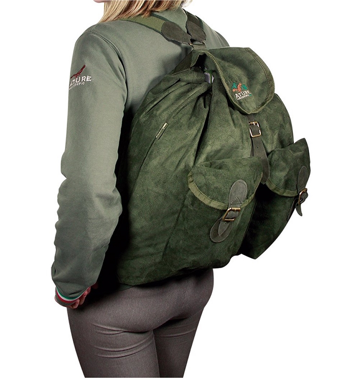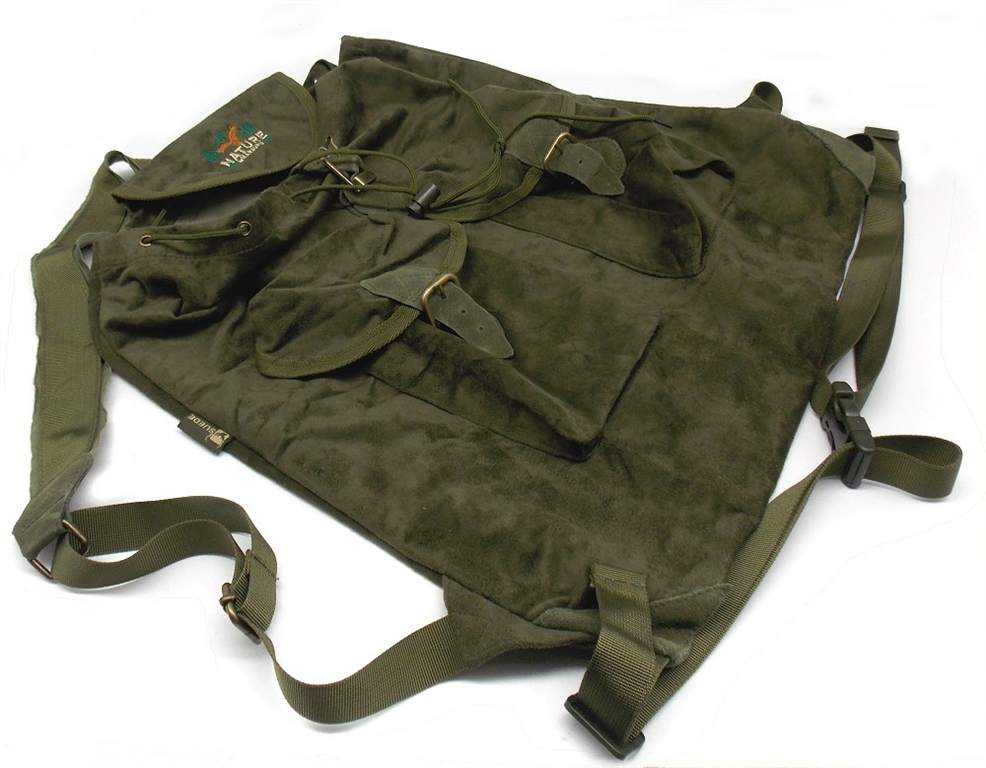Bisaccia in in tessuto Suede (microfibra), silenzioso ed impermeabile. Capacità: 20 litri. Peso: 445 grammi. Dimensioni: 52x46 cm. Con spallacci morbidi e regolabili, cinghia a vita regolabile, 2 tasche frontali porta oggetti. Colore verde. Prodotto in Italia. Peso lordo: 485 grammi.