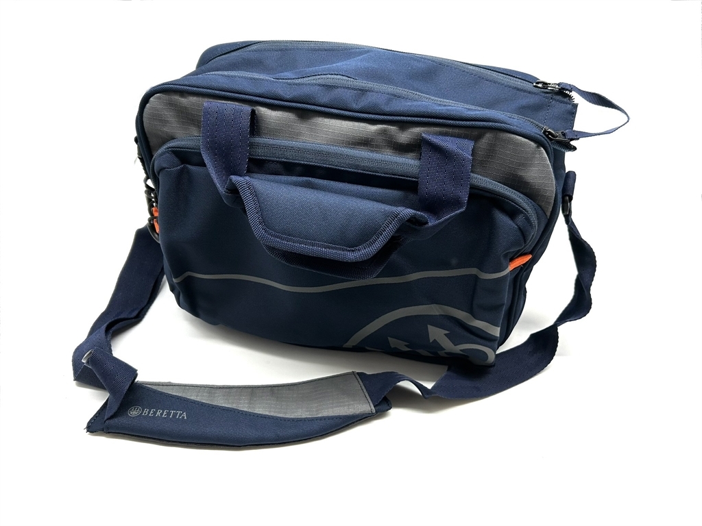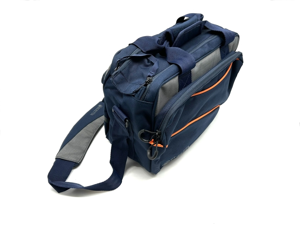 Borsa porta cartucce di colore blu, modello Uniform Pro blu con inserti arancioni, realizzata in materiale idrorepellente e resistente, per contenere fino a 250 cartucce con tre scomparti con tracolla regolabile. Ideale per i campi da tiro. Dimensioni: 25x42x20 cm. Peso lordo: 585 grammi. Doppia impugnatura con velcro chiudibile. Tracolla regolabile e imbottita, ma non rimovibile. Ampia apertura con doppio cursore chiudibile con lucchetto. Tasca frontale con cerniera.