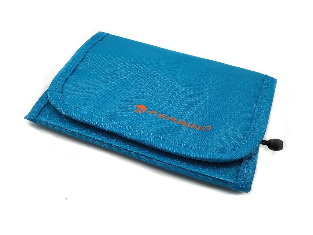 Portafoglio in nylon celeste con chiusura con velcro. Dotato di scomparto interno, portacarte, tasca con cerniera, e tasca trasparente. Peso lordo: 75 grammi. Dimensioni chiuso: 14x10 cm.
