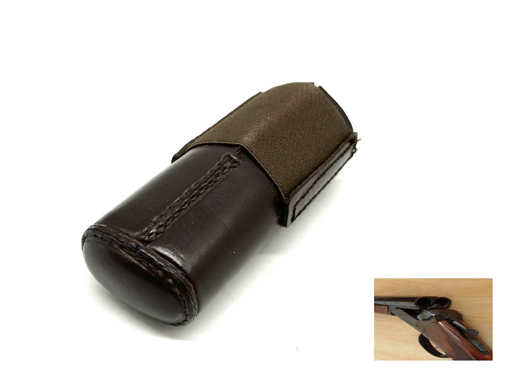 Copricanna in cuoio con elastico, per canne fucile Doppietta. Dimensioni: lunghezza cm 9, larghezza cm 4,5. Peso lordo: 30 grammi. Prodotto Made in Italy.