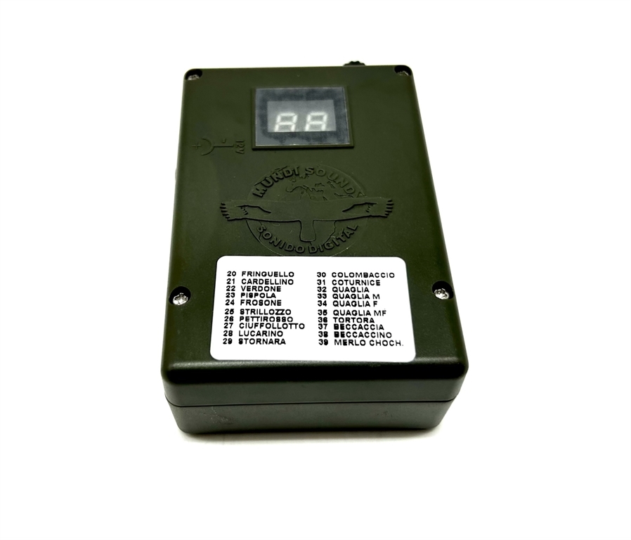 Funzionamento a batteria 9 volt in dotazione. Dotato di due uscite: alimentazione supplementare da 12 v, altoparlante supplementare. Dotato di altoparlante incorporato. Dimensioni: cm 9x6x3. Dotato di custodia in tela con moschettone. Contiene i seguenti canti: 2 canti di allodole, 4 canti di tordi, cesena, finguello, merlo, storno, pavoncella,piviere,fischione,alzavola,germano,codone,marzaiola.moriglione,folaga, beccaccino,fringuello, cardellino,verdone, pispola, frosone, strillozzo, pettirosso, ciuffollotto, lucarino, stornara, colombaccio, coturnice, 4 canti di quaglie, tortora, beccaccia, beccaccino, merlo choch. Non utilizzarlo per più di due ore consecutive. Prodotto in Spagna. Peso lordo: 158 grammi