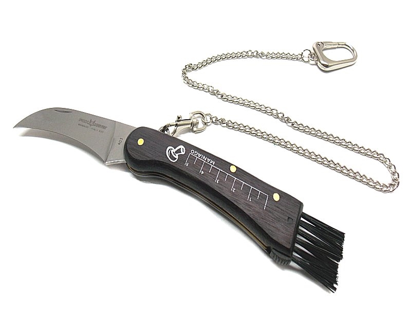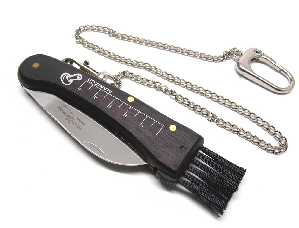 Coltello sportivo. Manico in legno con misurometro stampato sul manico. Catenella con moschettone con gancio. Spazzolino in setola. Prodotto in Italia. Peso lordo: 148 grammi.