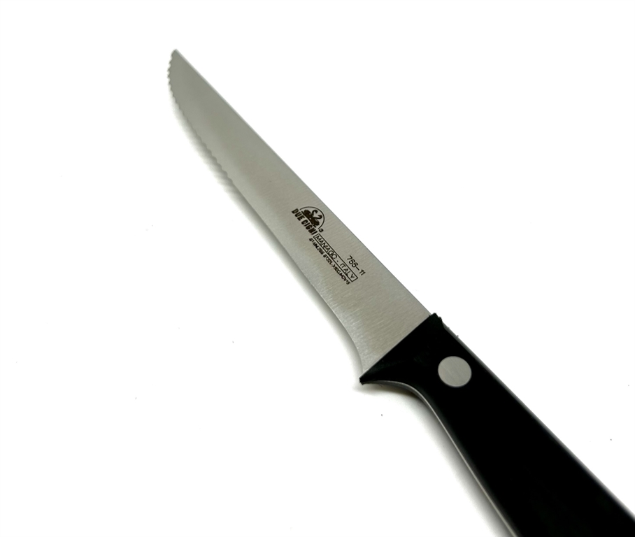 Coltello da cucina. Lunghezza lama 12 cm, larghezza 2 cm, lunghezza totale 22 cm. Acciaio inox forgiato con manico pom per lavastoviglie. Prodotto in Italia. Peso lordo: 55 grammi