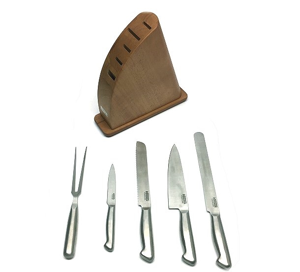 Ceppo 5 tagli in legno completo di coltelli serie manico inox. I coltelli sono da: spelucchino (lunghezza totale 22 cm, lunghezza lama 11 cm, larghezza lama 2 cm), forchettone (lunghezza totale 28,5 cm), pane (lunghezza totale 31,5 cm, lunghezza lama 19 cm, larghezza lama 3 cm), prosciutto (lunghezza totale 36,5 cm, lunghezza lama 24 cm, larghezza lama 2,6 cm), cucina (lunghezza totale 31,5 cm, lunghezza lama 19 cm, larghezza lama 4,5 cm). Dimensioni ceppo: larghezza 28 cm, altezza 29 cm, spessore 8 cm. Peso lordo: 2995 grammi.