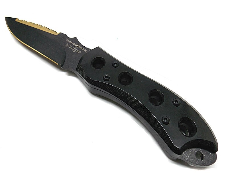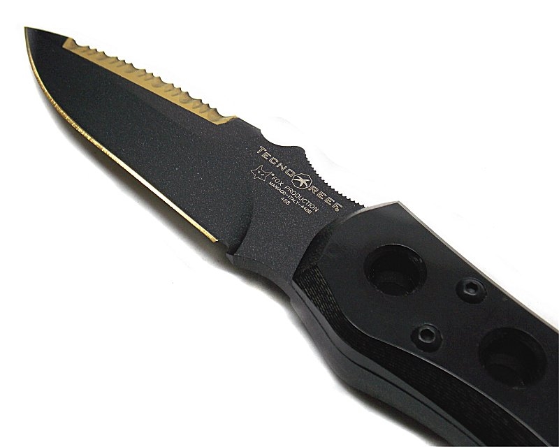 Coltello sportivo. Lunghezza lama 11 cm. larghezza lama 3 cm. Lunghezza totale aperto 23 cm. Lama in titanio rivestita in teflon nero. Coltello dotato di fodero in nylon nero. Prodotto in Italia. Peso lordo: 463 grammi.
