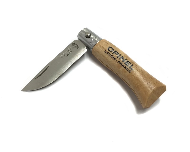 Coltello sportivo. Coltello chiudibile con lama in acciaio inox. Manico in legno chiaro stagionato a forma leggermente anatomico. Lunghezza lama 3 cm, lunghezza totale aperto 8 cm, larghezza lama 0,8 cm. Prodotto in Francia. Peso lordo: 5 grammi.