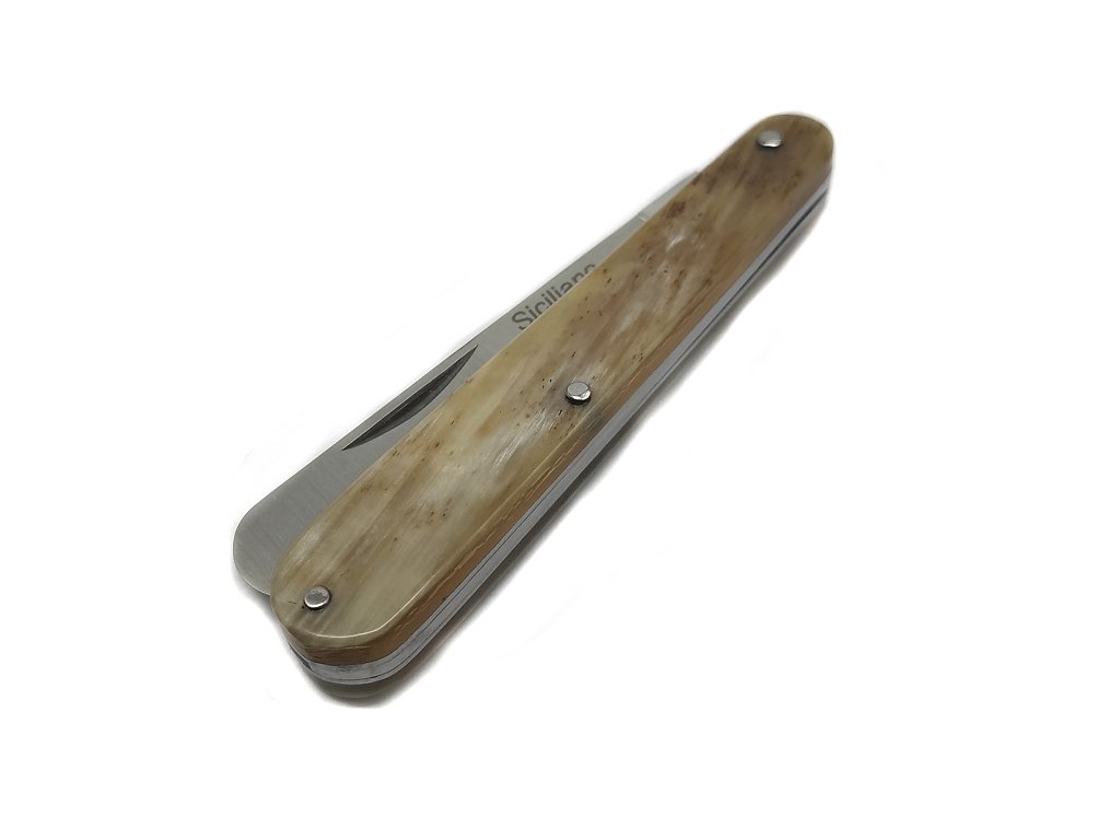 Coltello sportivo. Coltello siciliano con manico in corno biondo. Lunghezza lama 7 cm, larghezza lama 1,3 cm, lunghezza totale aperto 17 cm. Lama in acciaio AISI 420 J2. Prodotto in Italia. peso lordo: 52 grammi.
