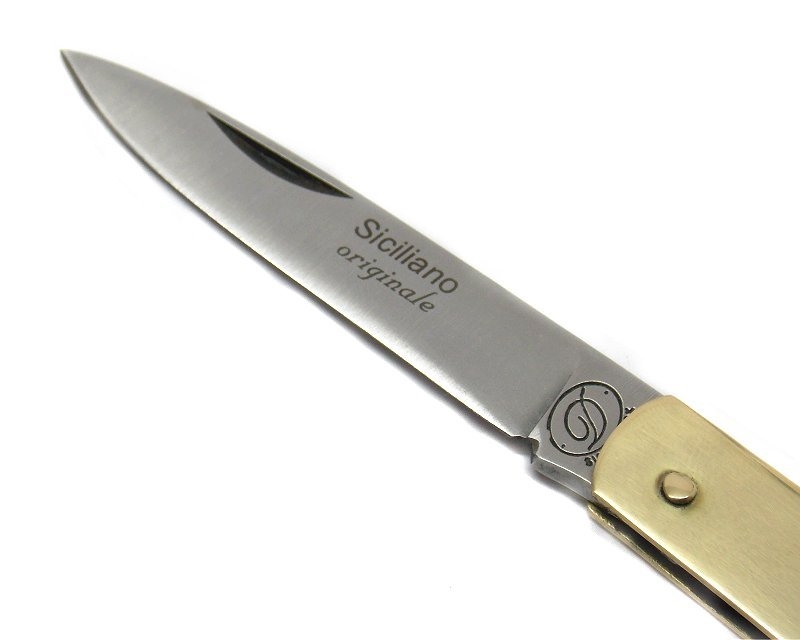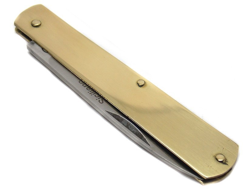 Coltello sportivo. Lunghezza lama 10 cm, larghezza lama 1,5 cm. Lama in acciaio inox e manico in ottone. Prodotto in Italia. Peso lordo: 74 grammi.