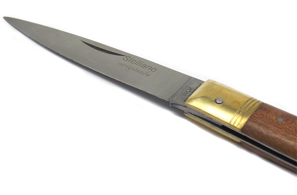 Coltello sportivo. Lunghezza lama 9,5 cm, larghezza lama 1,8 cm, lunghezza coltello aperto 23 cm. Manico in legno marrone scuro. Sulla lama incisione laser: Caltagirone. Peso lordo: 92 grammi.