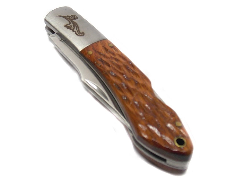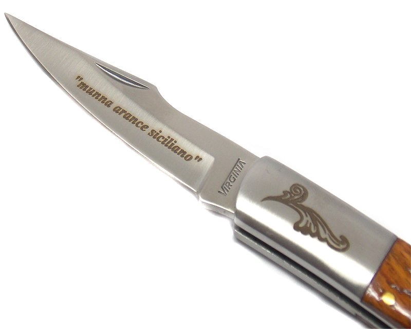 Coltello sportivo. Lunghezza lama 7 cm, larghezza lama massima 1,6 cm, lunghezza totale aperto 17,2 cm. Lama in acciaio, manico in osso. Dotato di blocco lama. Sulla lama incisione laser: munna arance siciliano e disegno barocco sulla testina. Il coltello usato per munnare le arance di Sicilia. Peso lordo: 90 grammi.
