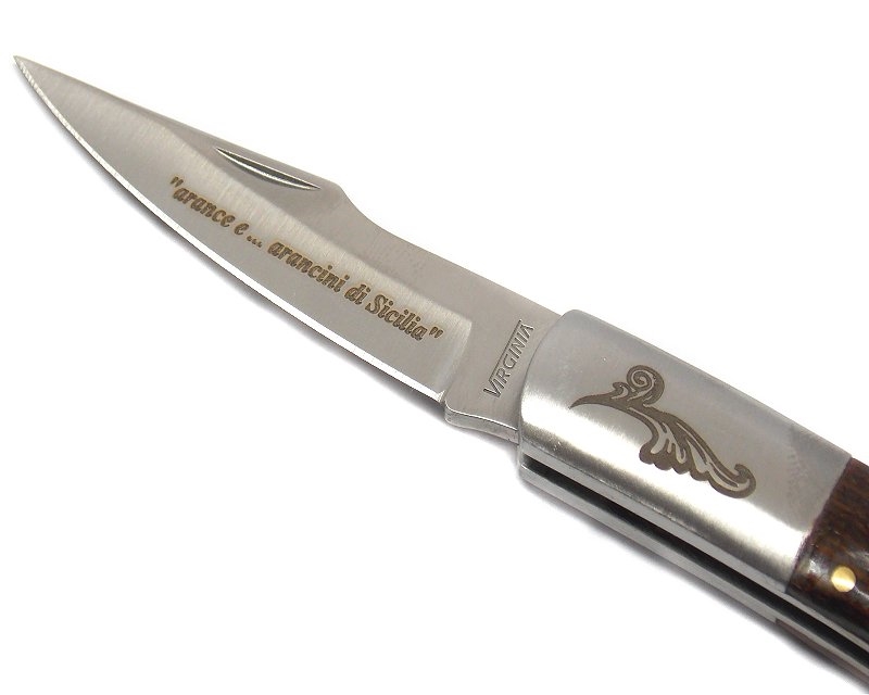 Coltello sportivo. Lunghezza lama 7 cm, larghezza lama massima 1,6 cm, lunghezza totale aperto 17,2 cm. Lama in acciaio, manico in osso. Dotato di blocco lama. Sulla lama incisione laser: arance e arancini di sicilia e disegno barocco sulla testina. Nel ricordo del barocco della splendida val di noto il coltello usato per munnare le arance di sicilia, ricorda anche ai golosi dei mangiari siciliani, le buonissime arancine di questa zona della Sicilia. Peso lordo: 90 grammi.