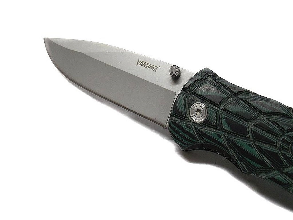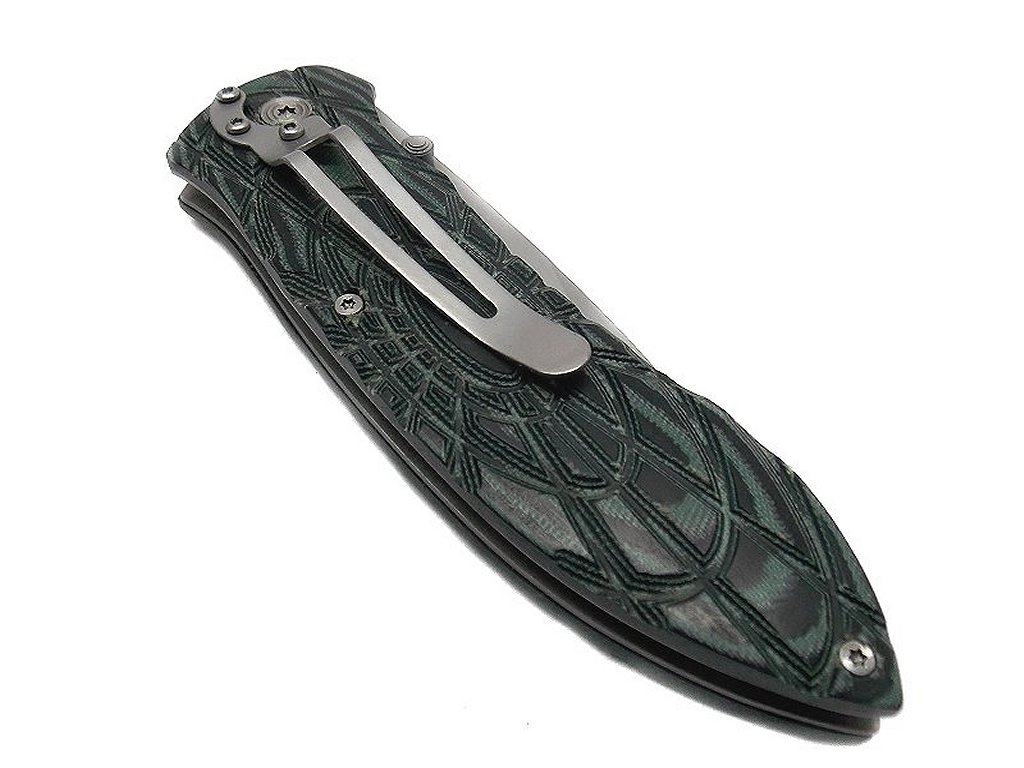 Coltello Sportivo. Lunghezza lama 9,5 cm, larghezza lama massima 3 cm, lunghezza totale aperto 22 cm. Dotato di clip per metterlo al cinto. Lama in acciaio 440 s.s. manico in legno verde con incisione ragno. Peso lordo: 170 grammi.