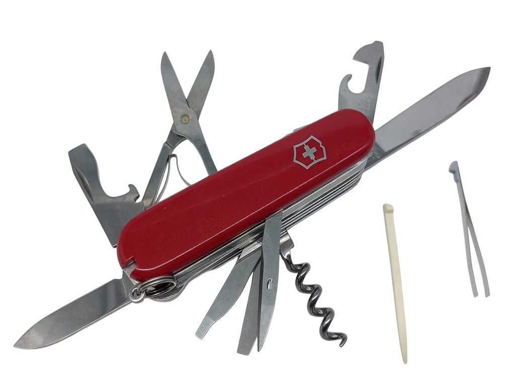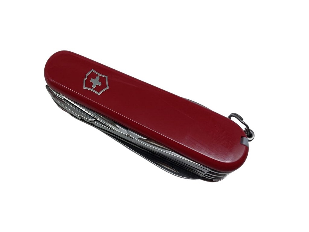 Coltello sportivo. Dotato di: lama grande, lama piccola, cavatappi, apriscatole con - cacciavite piccolo, levacapsule con - cacciavite-spelafili, punteruolo, anello portachiavi, pinzetta, stuzzicadenti, forbici, gancio multiuso, sega per il legno, scalpello, lima per unghie con - lima per metalli - pulisci unghie - sega per metalli, cacciavite sottile, pinze con taglia fili. Lunghezza chiuso 9 cm. Guancette in plastica rossa lucida e croce incisa. Prodotto in Svizzera. Peso lordo: 162 grammi.